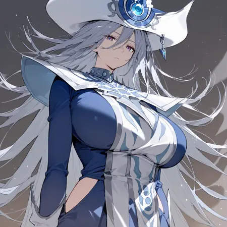 권장 사항: 1girl, 큰 가슴, 파란 눈, 긴 은색 머리, 성숙한 여자, 파란 드레스, 마녀 모자, 장갑, 무표정, :/