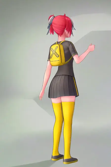 dsc-ami, 노란색 셔츠, 노란색 배낭, 노란색 허벅지 양말, 검은색 치마, 검은색 셔츠, 장갑, 단일 장갑, 학교 유니폼, 머리장식