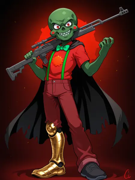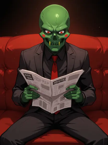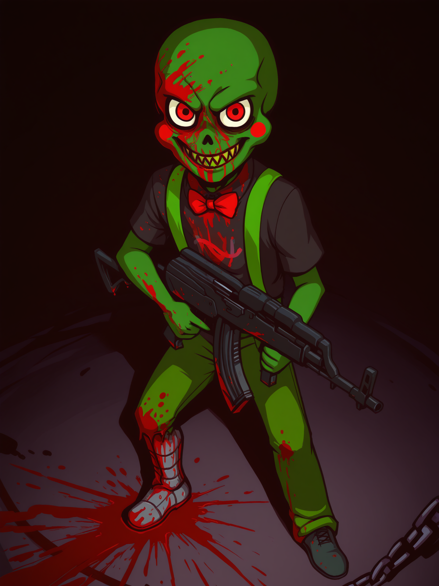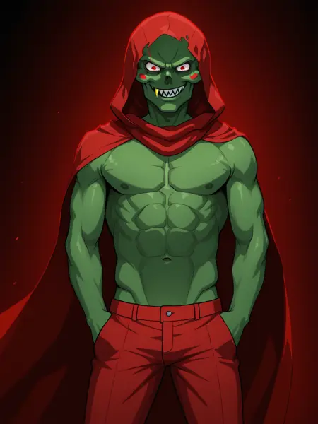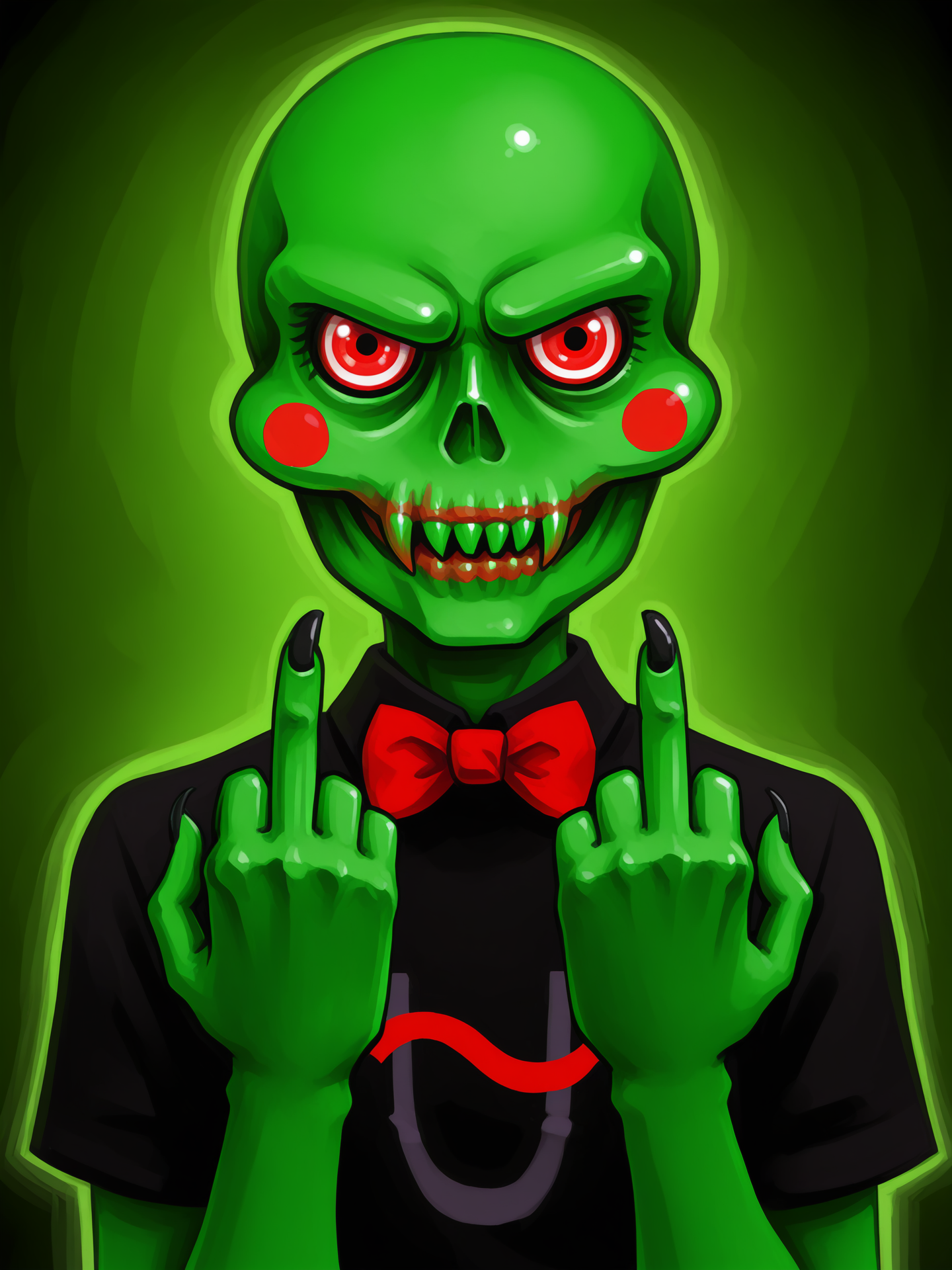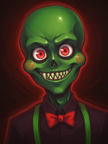 관련 프롬프트: 녹색 피부, 빨간 눈, 대머리, 날카로운 이빨, 볼 붉은 스티커