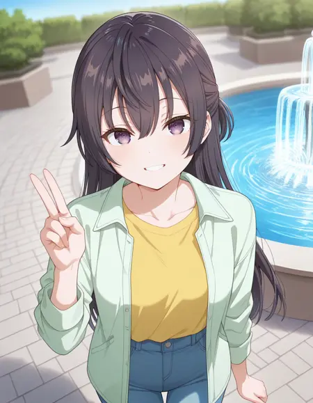 date outfit, collarbone, green jacket, open clothes, yellow shirt, blue jeans, blue sneakers