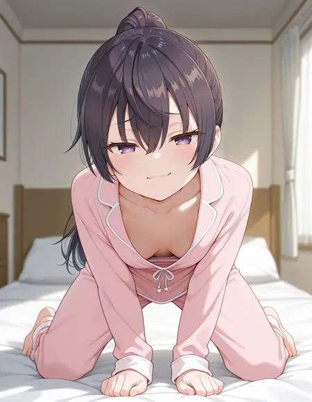 <lora:yuki_suou-roshidere_s1-ixl-anime-soralz:1>, yuki suou (roshidere), black hair, long hair, ponytail, hair between eyes, purple eyes