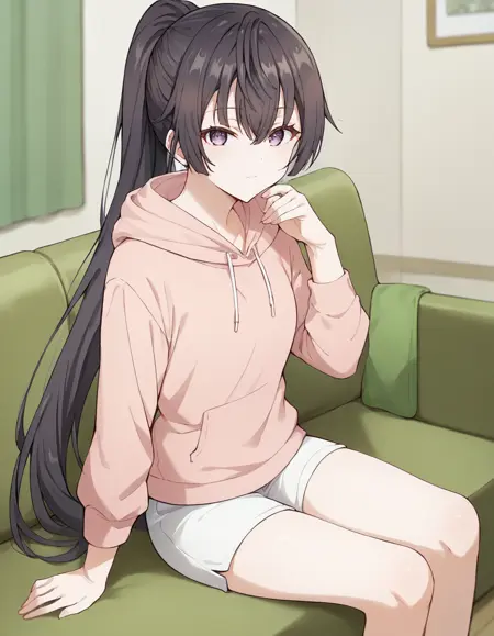 <lora:yuki_suou-roshidere_s1-ixl-anime-soralz:1>, yuki suou (roshidere), 黑发, 长发, 马尾, 发丝遮眼, 紫色眼睛