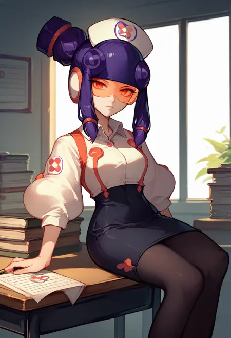 デフォルトの衣装: ヘルメット, 看護師の帽子, サングラス, 白いドレス, 紫色のボディスーツ, 白い手袋