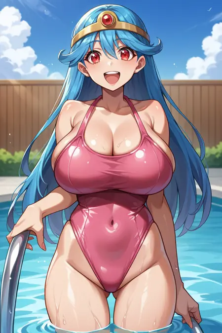 触发词为 "dq3sage",且必须包含 "蓝色头发,红色眼睛,长发"。