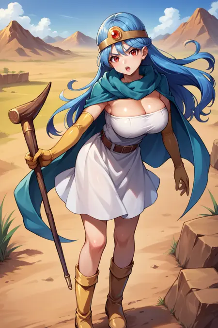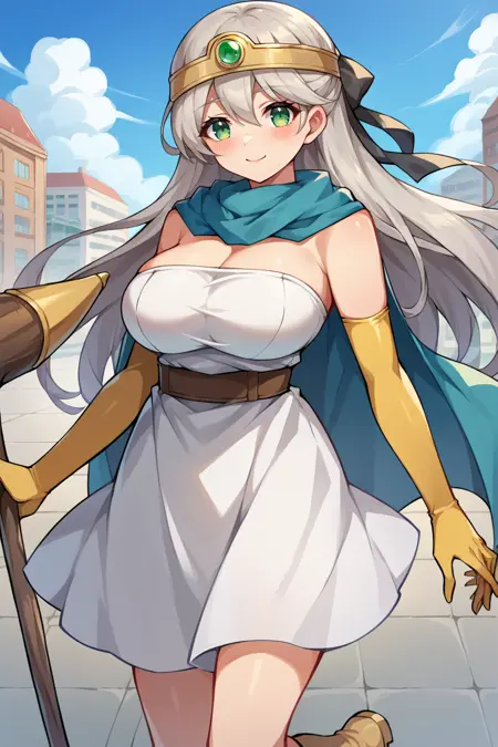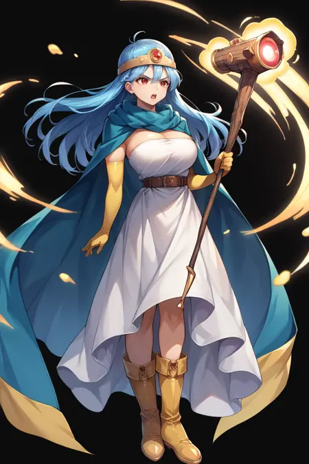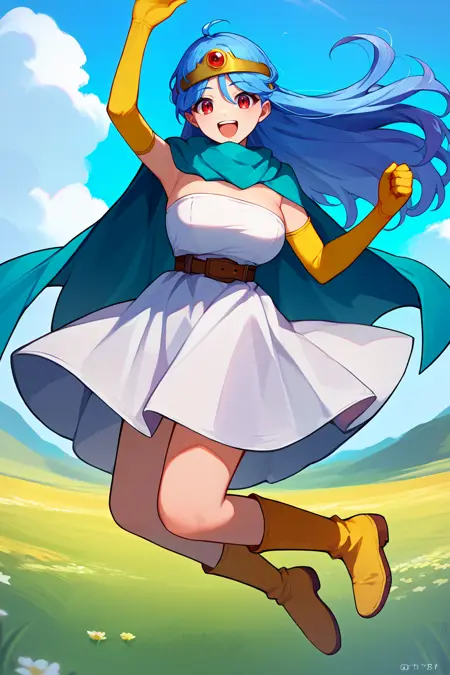 • 为展现她的典型形象,请添加 "头环、蓝色斗篷、白色连衣裙、无肩带、腰带、肘部手套、黄色手套、黄色靴子"。