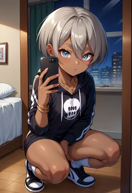 • 整体外观/基础信息Saitou,短发,灰发,深肤色女性,深色皮肤,头发遮住眼睛,灰眼睛,+ 你的服装标签