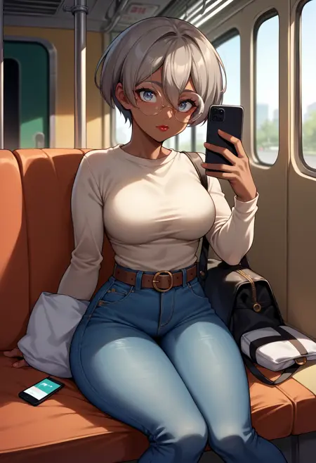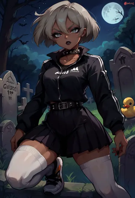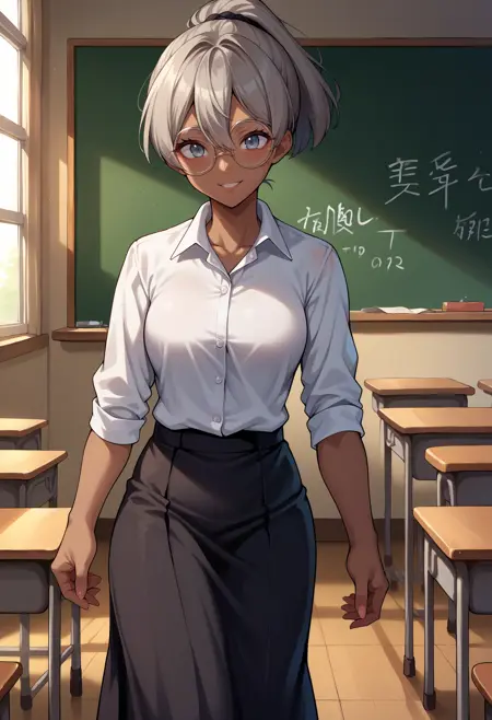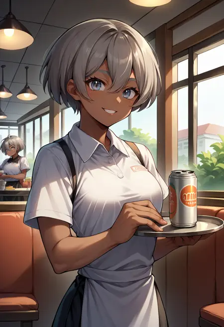 请记住,使用她的道馆馆主或休闲服装时,务必添加基础信息:短发,灰发,深肤色女性,深色皮肤,头发遮住眼睛,灰眼睛
