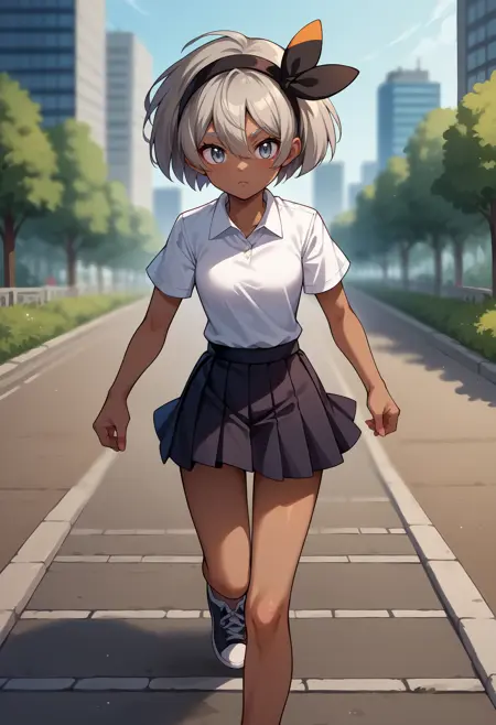 그녀의 짐 리더 복장 또는 일상 복장을 사용할 때 단발, 회색 머리, 검은 피부 여자, 검은 피부, 눈 사이 머리, 회색 눈이라는 기본 정보를 반드시 추가하세요!