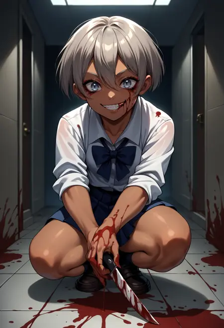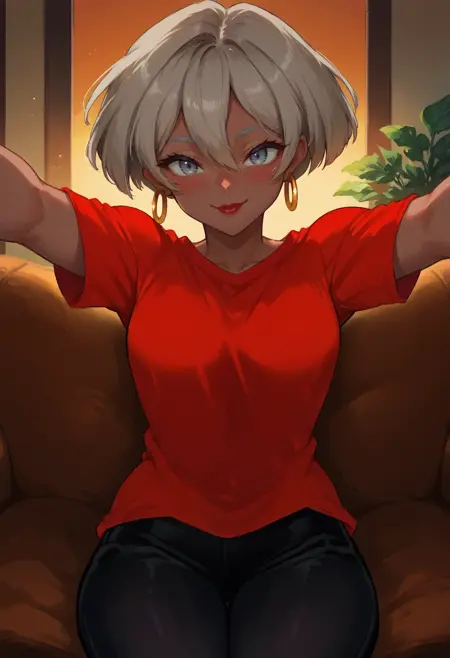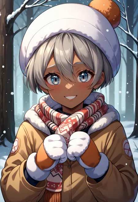 • "전체 외모/기본 정보": Saitou, 단발, 회색 머리, 검은 피부 여자, 검은 피부, 눈 사이 머리, 회색 눈, + 당신의 옷 태그