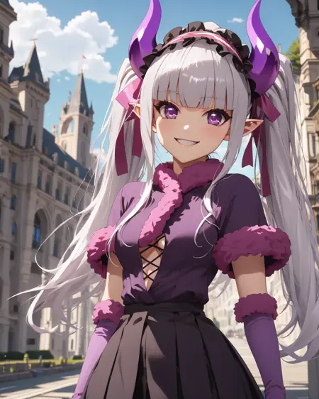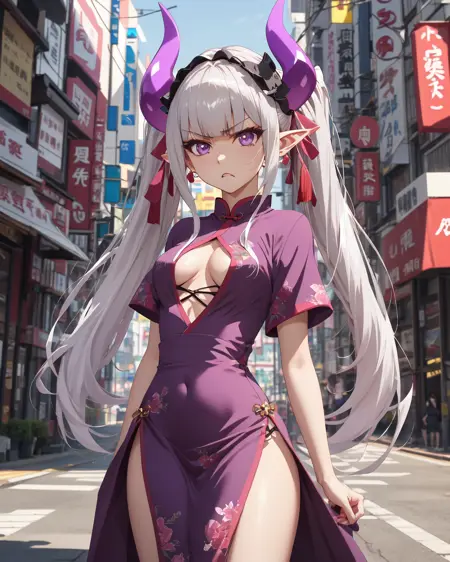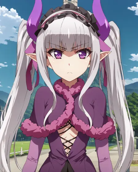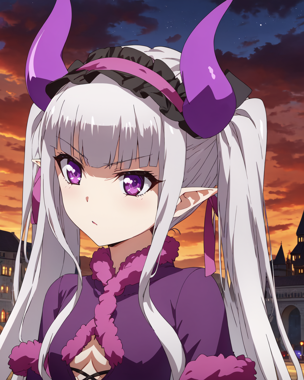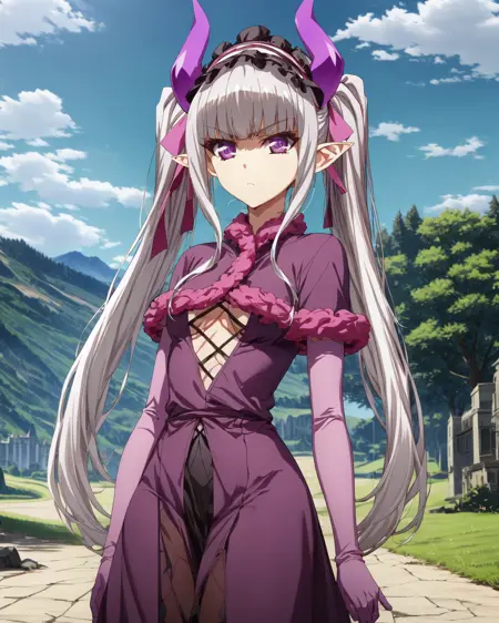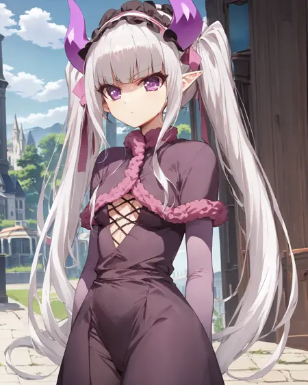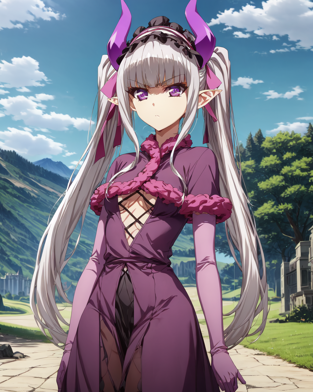 shelia,1girl,solo,horns, small_breasts, long_hair, purple_eyes, pointy_ears, straight_bangs, demon_girl, demon_horns, gray_hair, twin_tails,