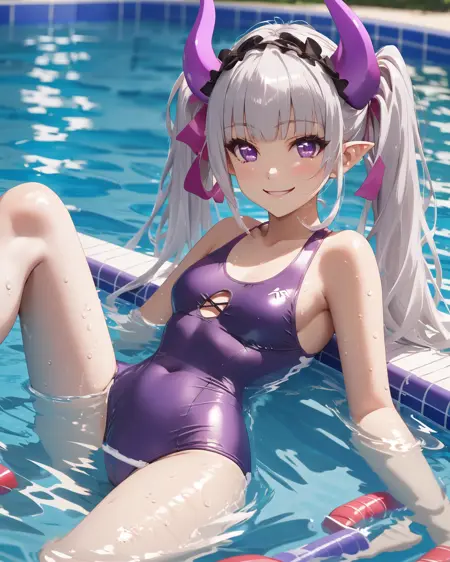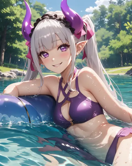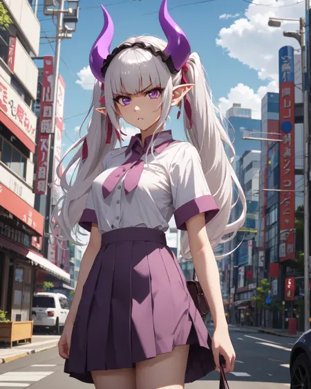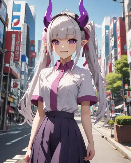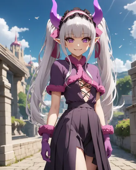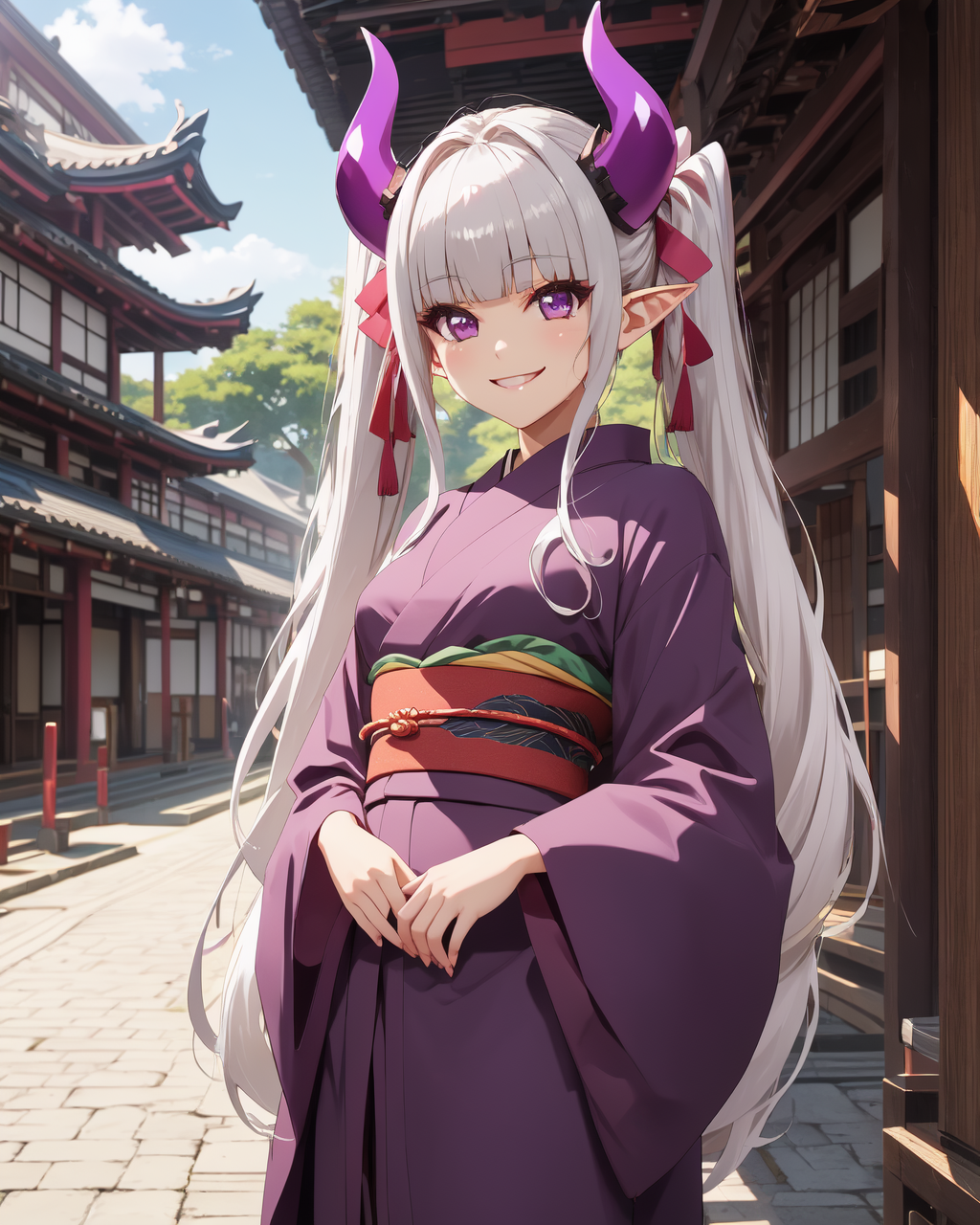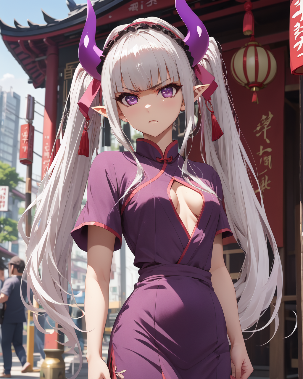 shelia,1girl,solo,horns, small_breasts, long_hair, purple_eyes, pointy_ears, straight_bangs, demon_girl, demon_horns, gray_hair, twin_tails,