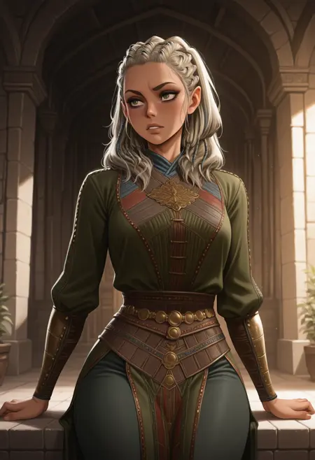 使用 'jaheiraArmor' 标签以使用她的游戏内盔甲,如果在穿着其他衣物时看到其残留部分,请将其添加到负面提示中。