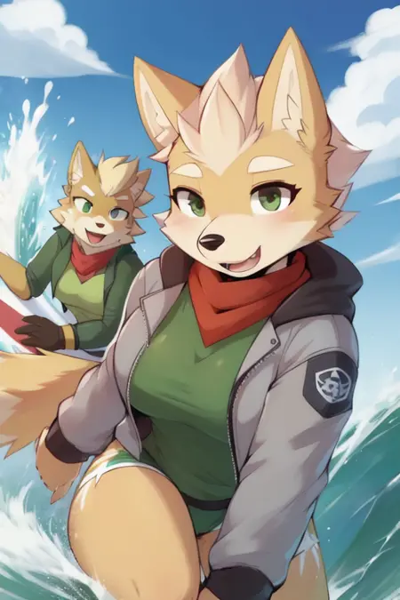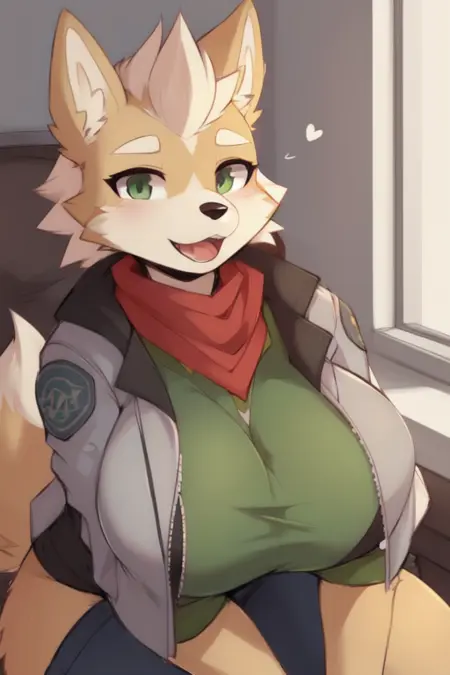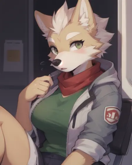mccloud, female, grey_jacket, green_shirt, red_bandana