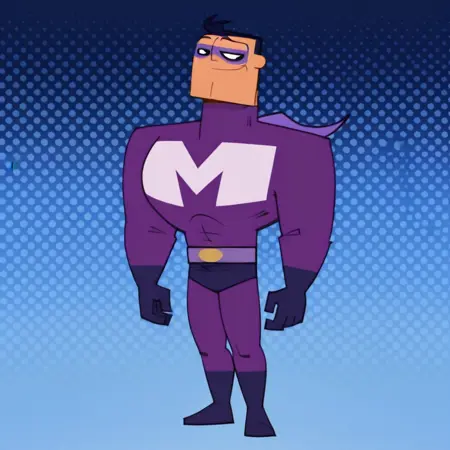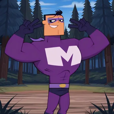 MaxumMan, 1boy, solo, black hair, black eyes, muscular, superhero, bodysuit, mask