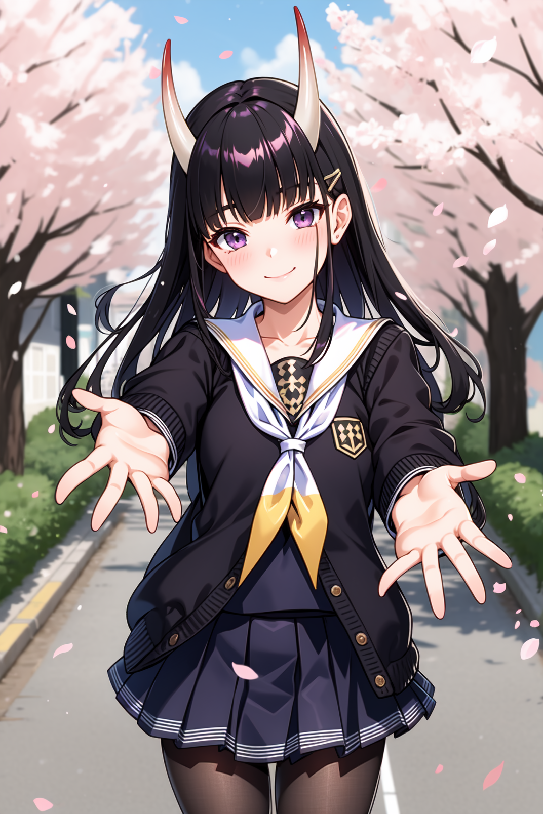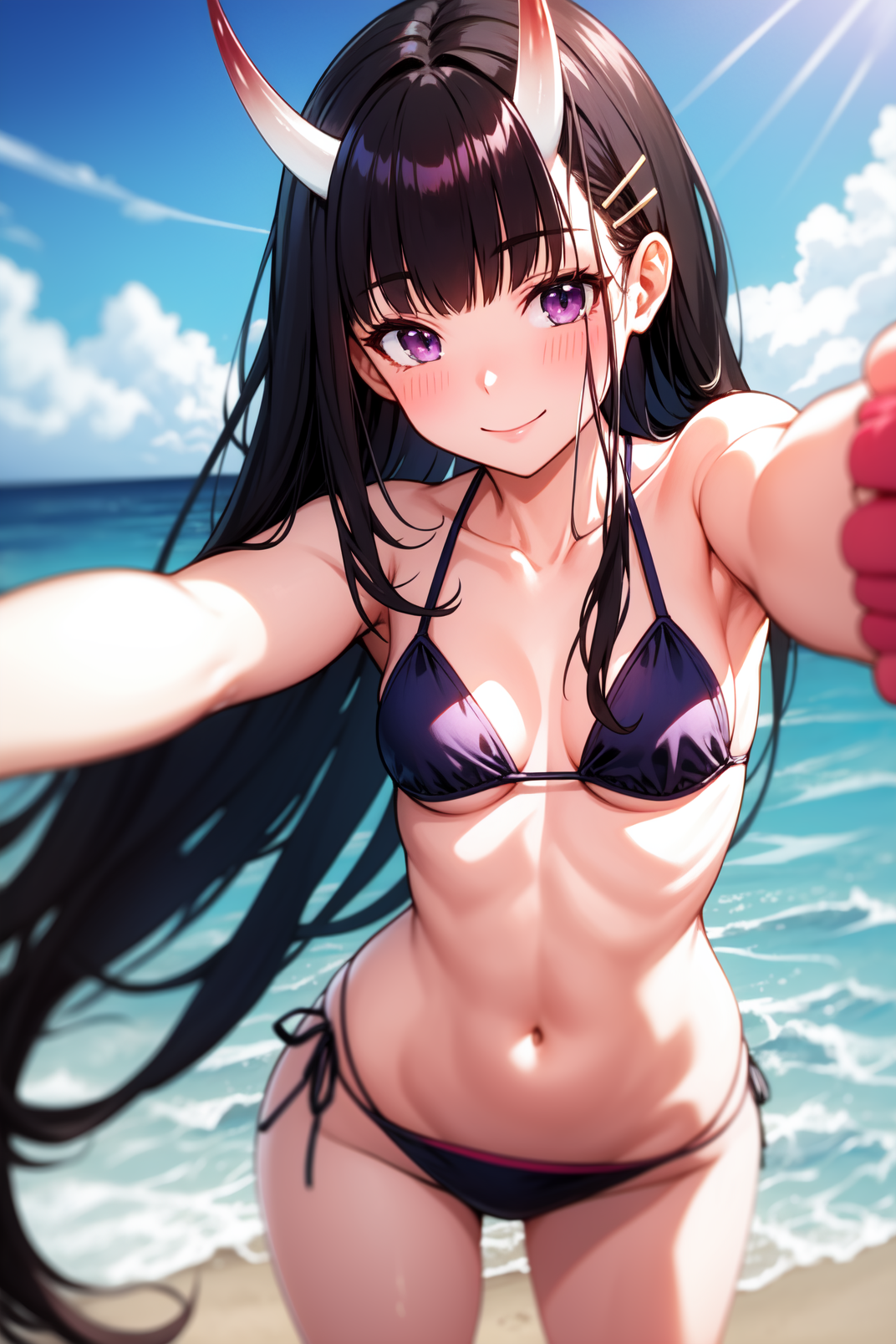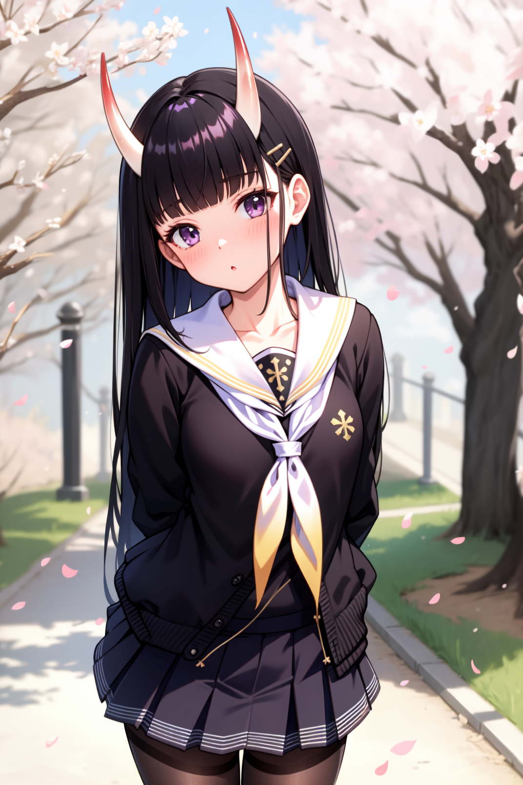 noshiro, purple eyes, black hair, very long hair, bangs, hair clip, oni horns