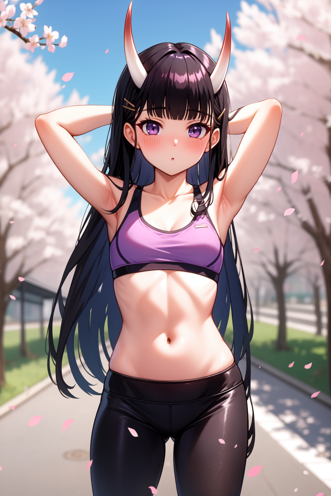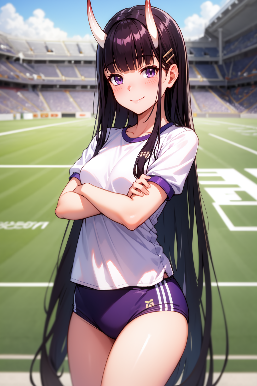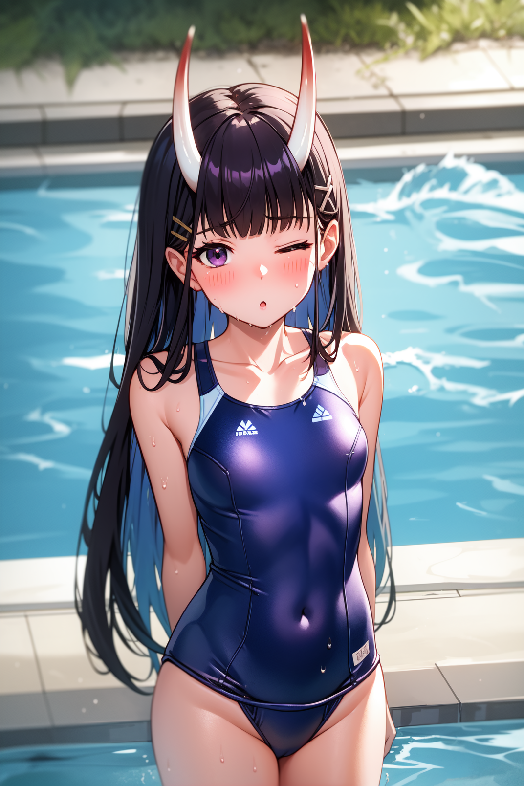 noshiro, purple eyes, black hair, very long hair, bangs, hair clip, oni horns