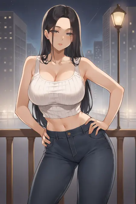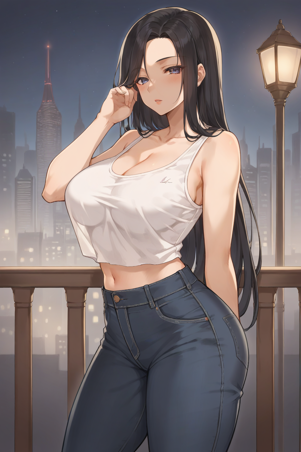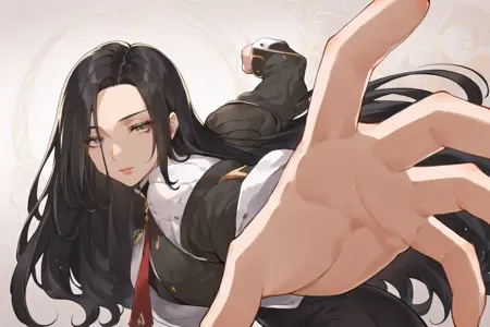 Triggers: black hair, grey eyes, half-closed eyes, parted bangs, long hair,
