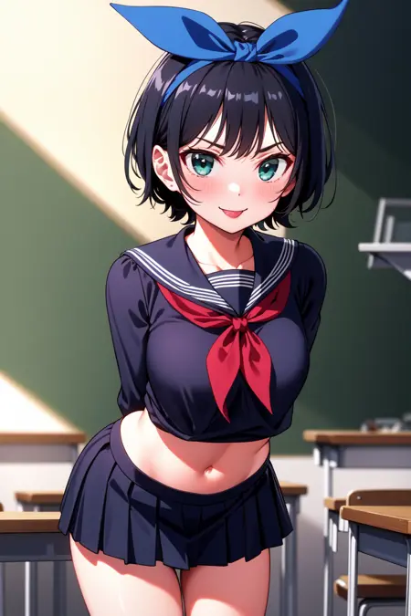외모: 루카, 녹색 눈, 검은 머리, 단발, 파란 헤드밴드, 파란 머리 리본