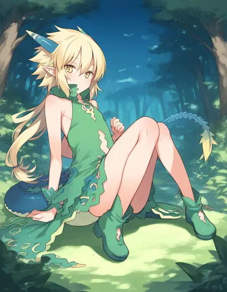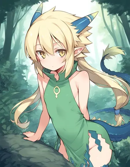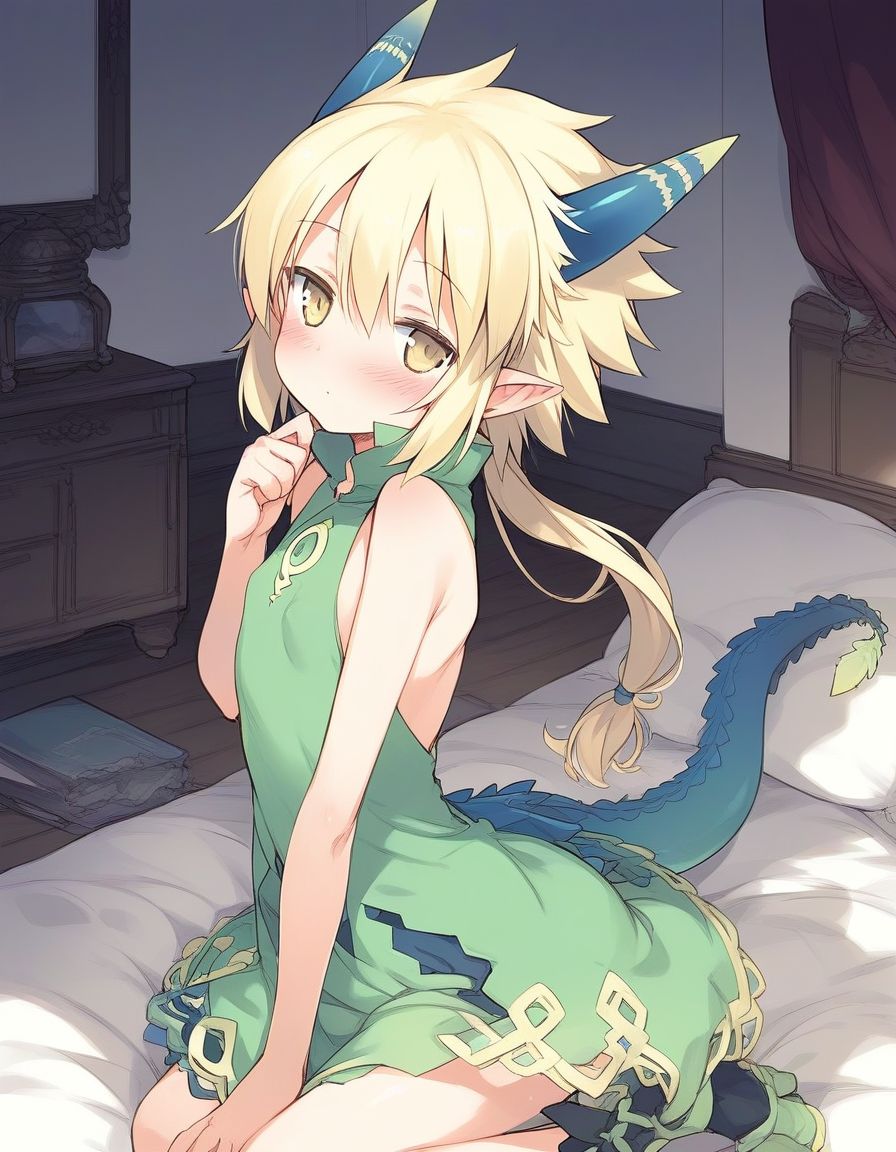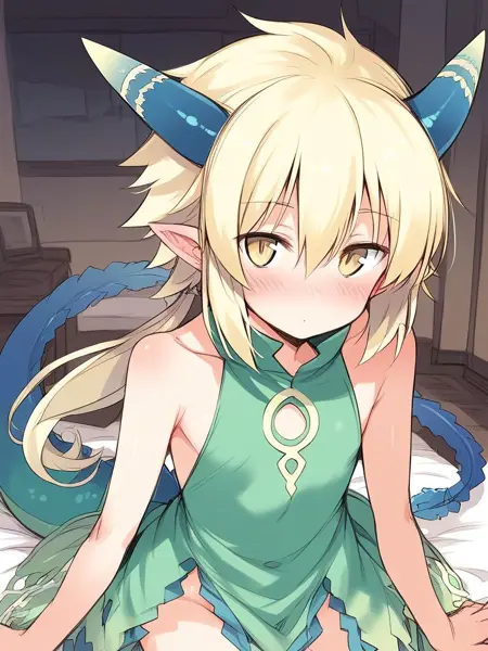 blonde hair, pointy ears, yellow eyes, horns, tail, long hair, dragon tail, flat chest, hair between eyes, low-tied long hair,