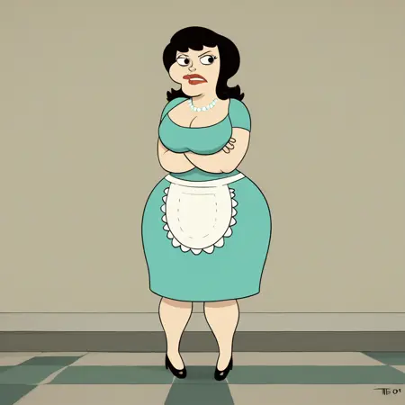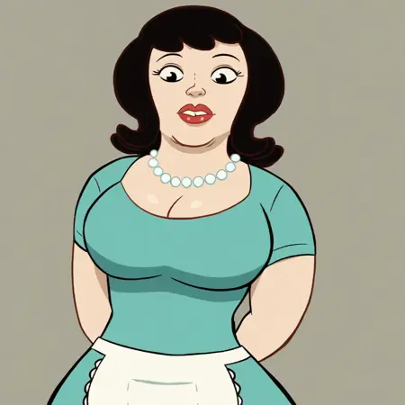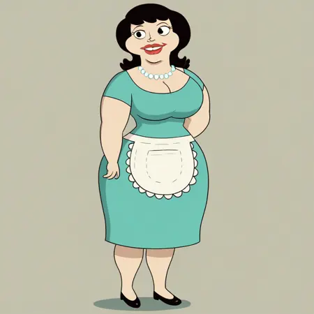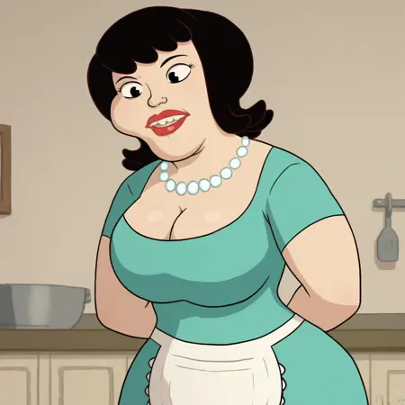 dress, short sleeves, white apron, pearl necklace, large breasts, cleavage,