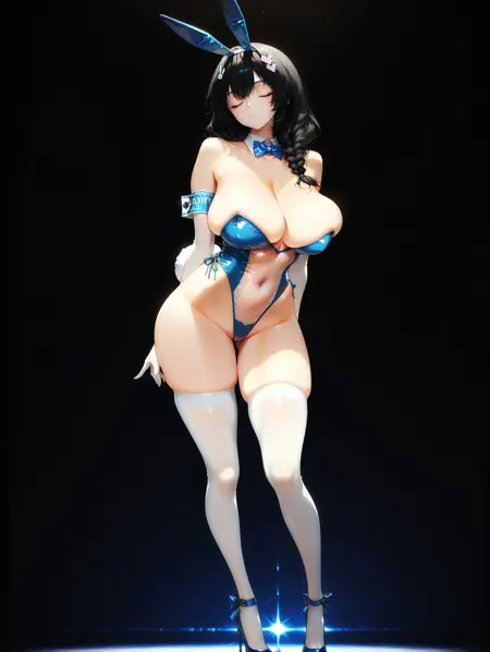 衣装 プロンプト:animal ears, rabbit ears, playboy bunny, fake animal ears, leotard, detached collar, thighhighs, gloves, white gloves, bow, elbow gloves, bowtie, white thighhighs, cleavage, blue bow, blue leotard, hair ornament, tail, highleg, bare shoulders, rabbit tail, see-through, highleg leotard, skindentation, high heels, covered navel, blue footwear, armband, strapless leotard