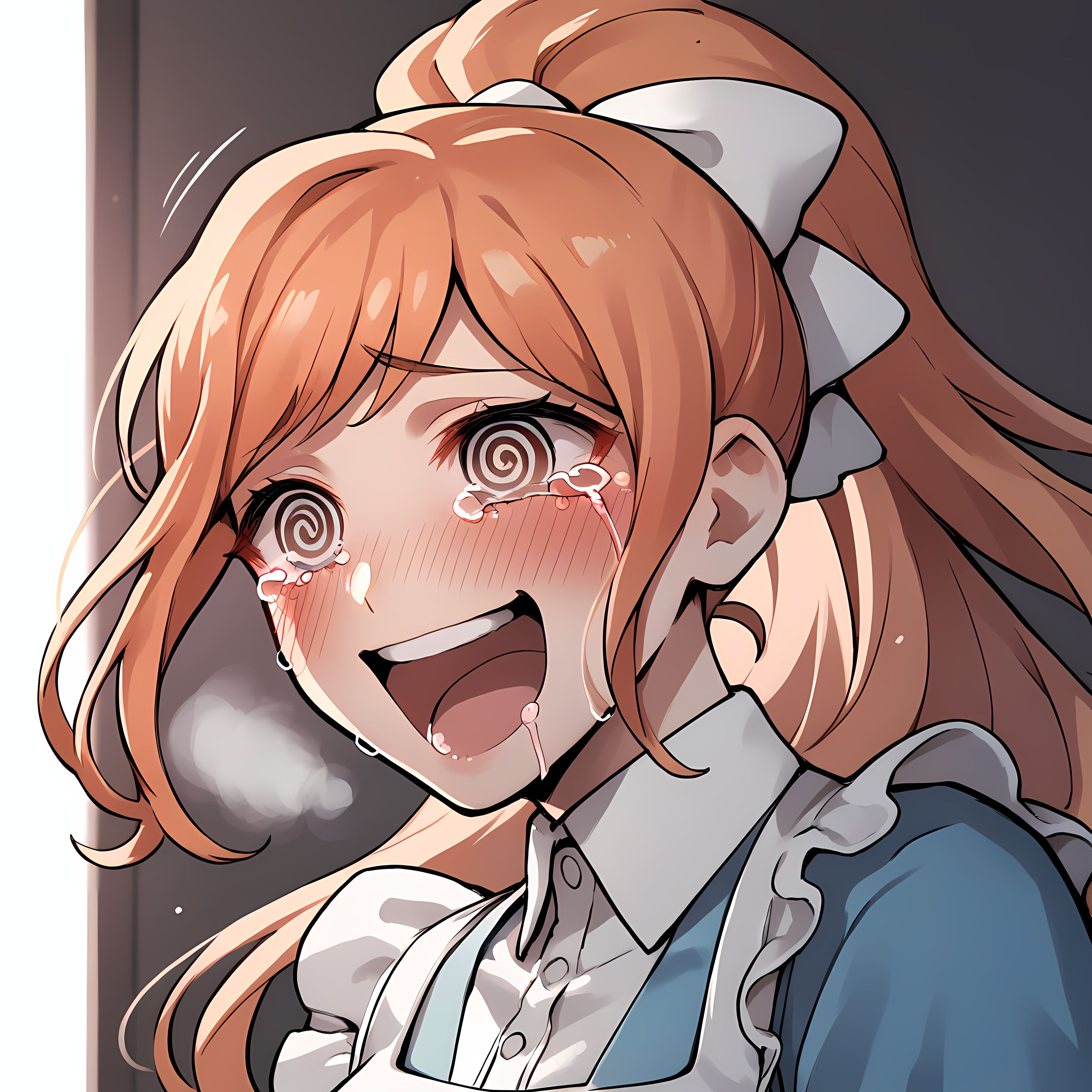 green eyes, orange hair, ponytail, blue dress, white apron, black pantyhose
