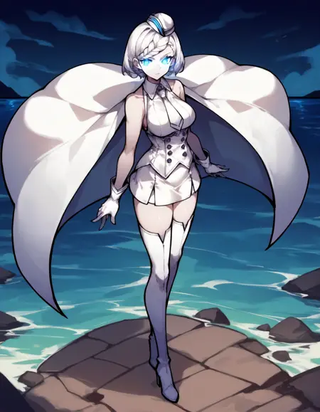 하얀 망토, 소매 없는 하얀 셔츠, 분리된 칼라, 하얀 넥타이, 하얀 장갑, 하얀 스커트,