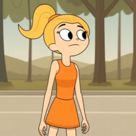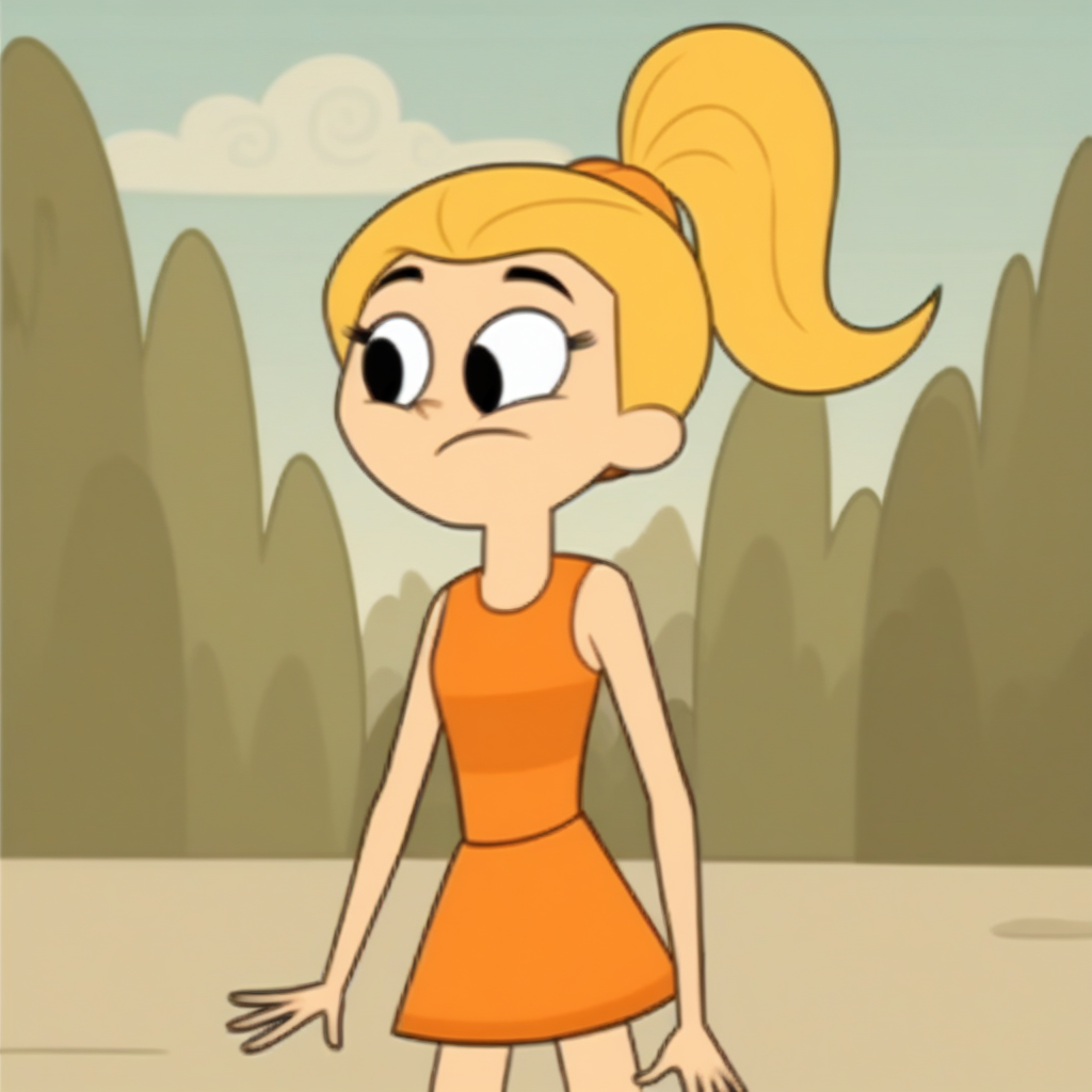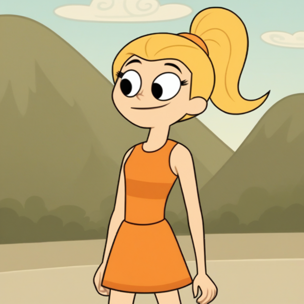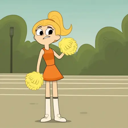 PaigeGoodcheer, 1girl, solo, blonde hair, ponytail, black eyes,