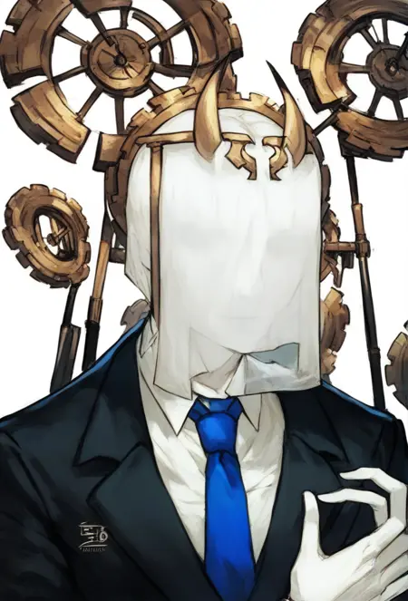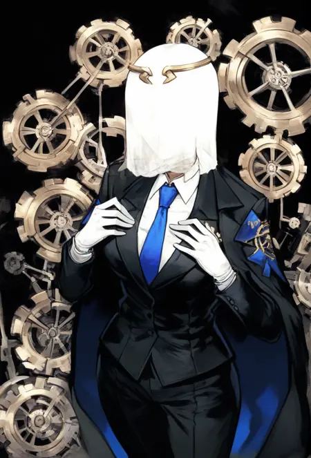 EileenEnsemble, faceless head, white shirt, blue necktie, black jacket, black pants, black footwear, formal, white gloves
