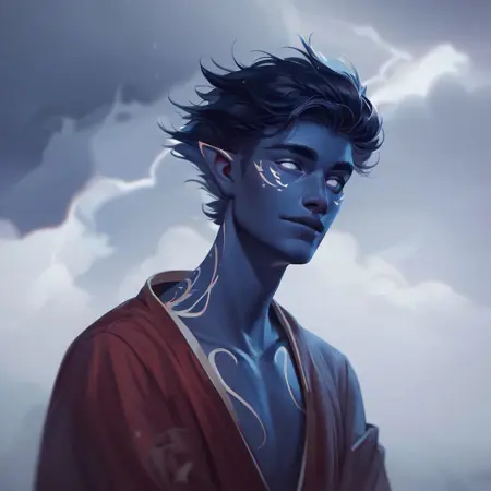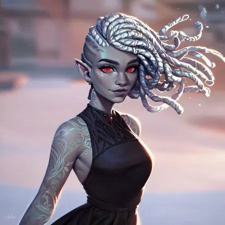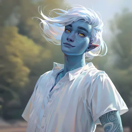 示例提示:AirGenasi、尖耳朵、风、凌乱的头发、纹身、1girl、蓝色皮肤、白发、红眼,