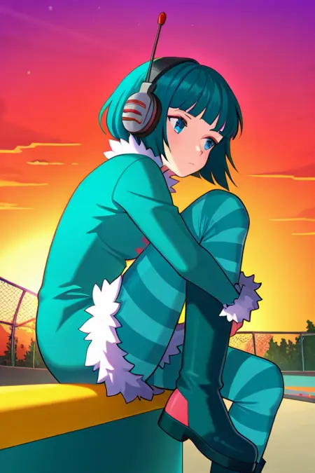 衣装キーワード: ターコイズ色のドレス、ヘッドフォン、アンテナ、インラインスケート、ファーのトリム、ターコイズストライプのストッキング