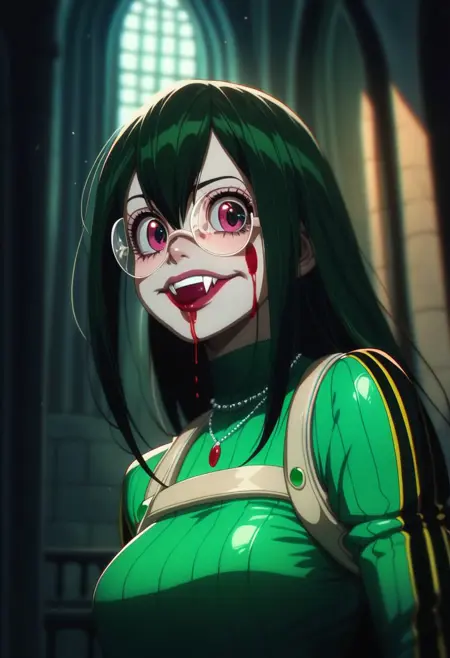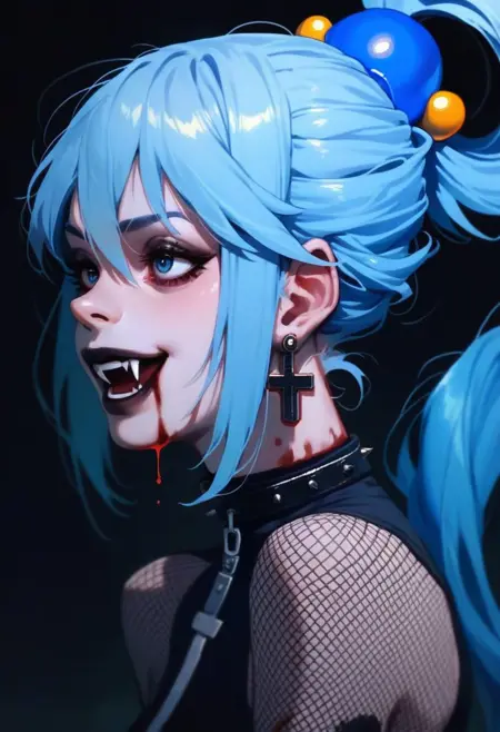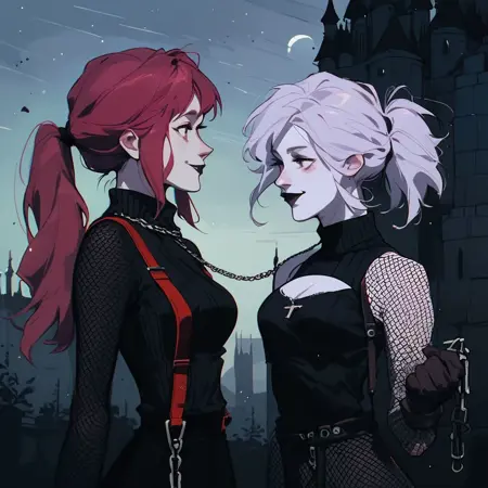 基础提示词: score_9, score_8_up, score_7_up, score_6_up, pastel paint, 1girl, vampire girl, black hair, black dress, turtleneck, vamp style, goth core, vamp goth, goth style, fishnets, dripping, blood, cross earrings, cross collar, outdoors, moon on background, bats, starry sky, goth castle, goth style, goth core