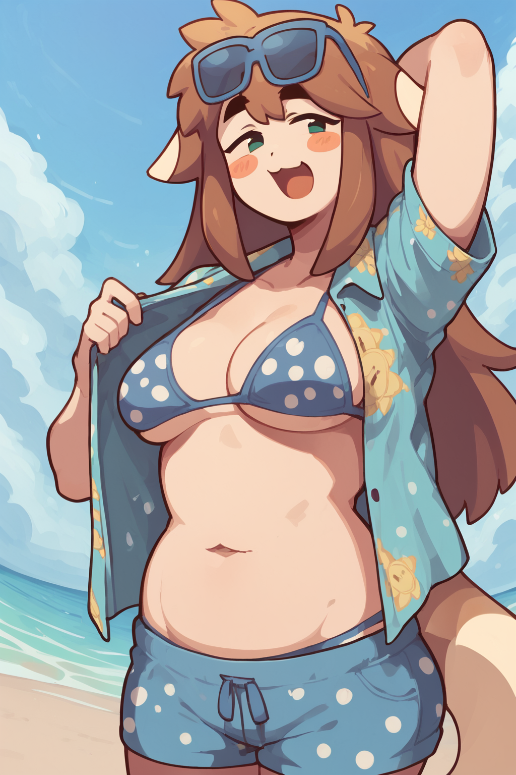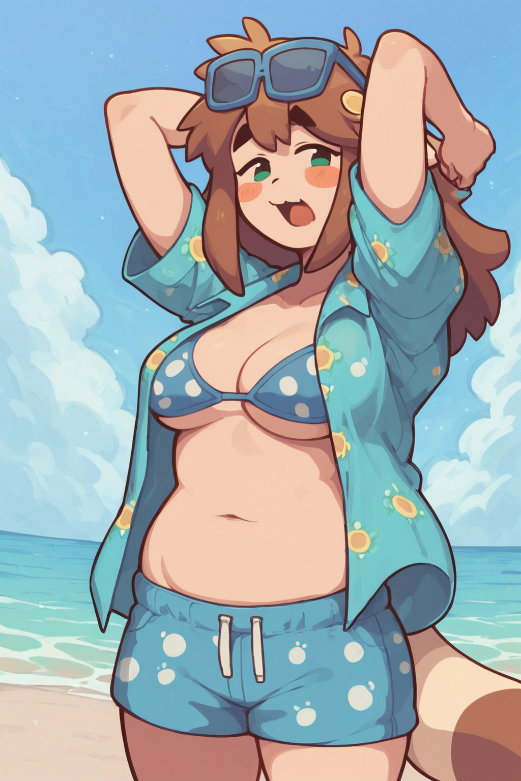 summ3r0utfit, glasses on head, blue sunglasses, blue shirt, open shirt, mario sunshine shirt, blue top, white dot bikini, blue shorts, hawaiian shirt,