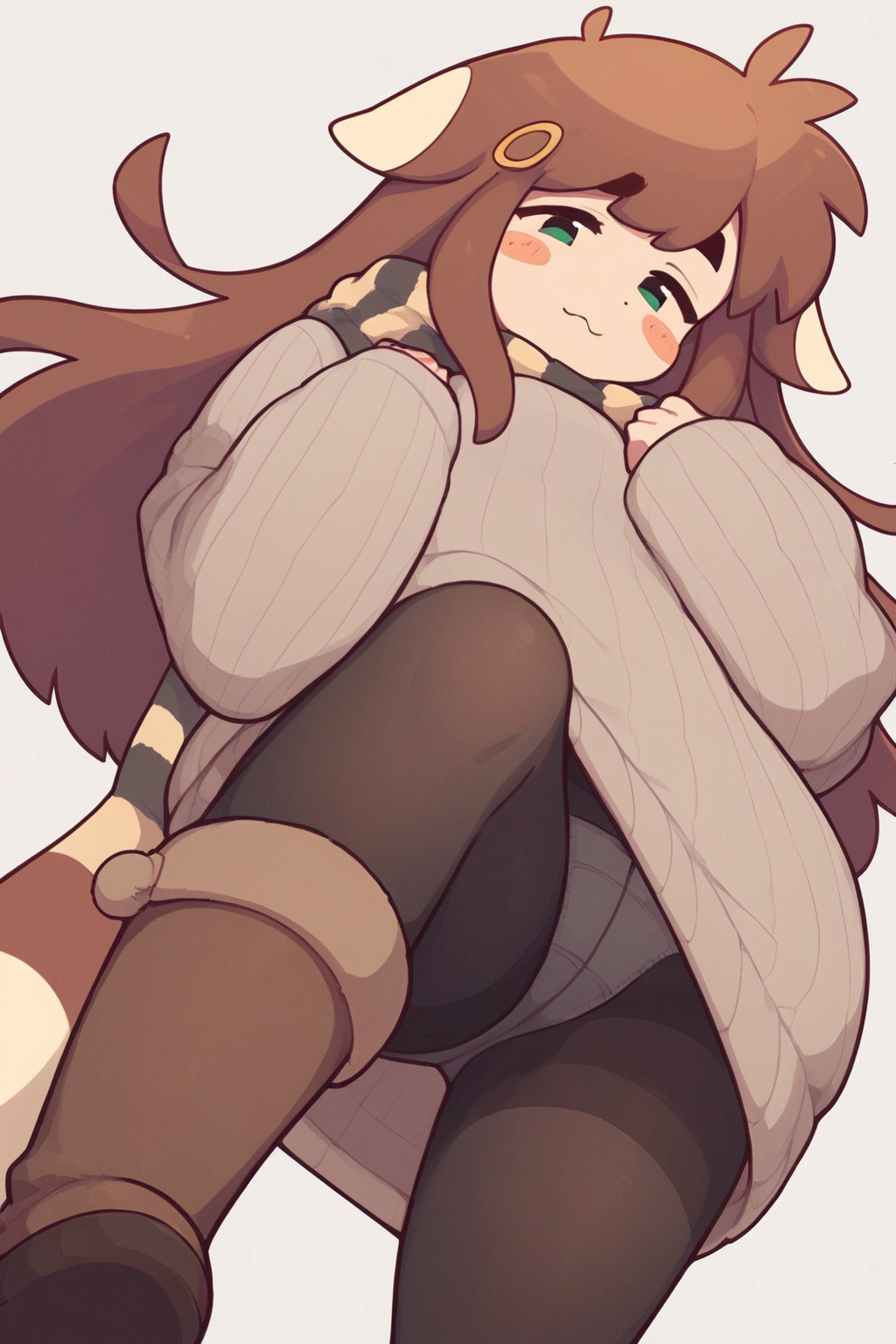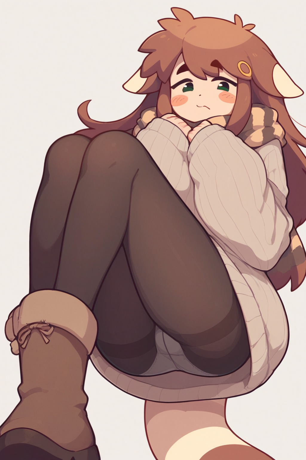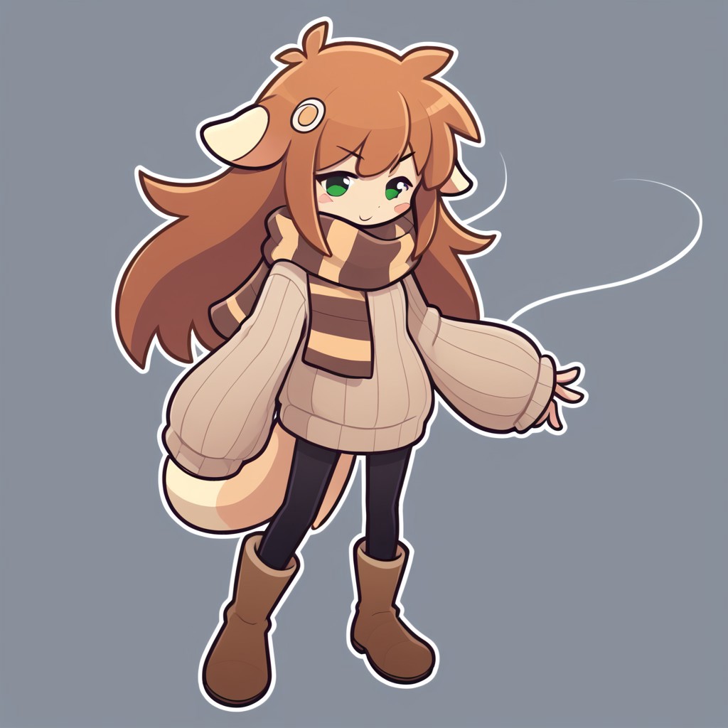 s3ntr3t0utfit, striped scarf, black pantyhose, blue shorts, legwear under shorts, brown boots, sleeves past fingers, puffy sleeves, fur-trimmed boots, sentret sweater,