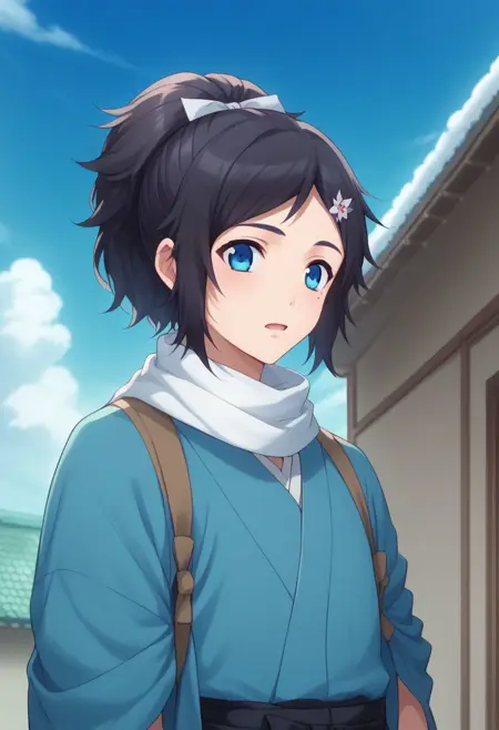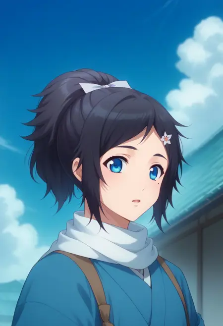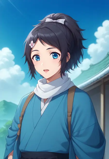 #2 - yasusada, 1boy, blue eyes, mole, mole under eye, japanese clothes, scarf, hair ornament, haori, black hair, hairclip, ponytail,