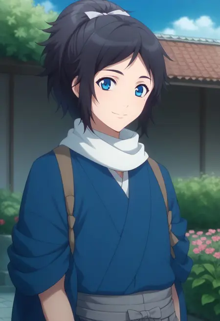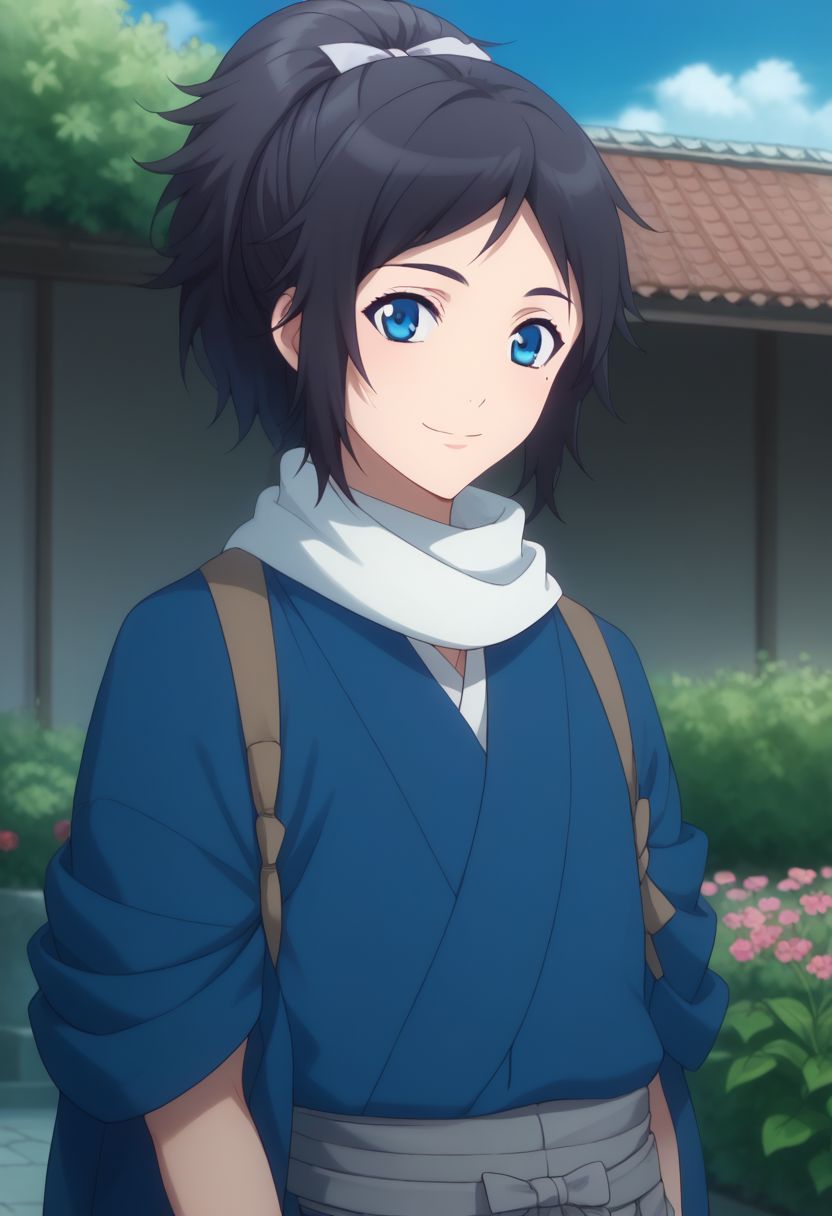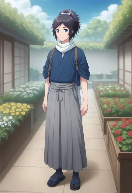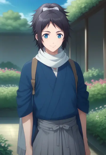 #1 - Yasusada, japanese clothes, 1boy, male focus, hakama, blue eyes, hakama skirt, skirt, scarf, white scarf, mole under eye, mole, tabi, black hair, sandals, ponytail,