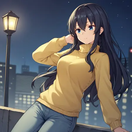 Default outfit - yellow sweater, long sleeves, turtleneck sweater, blue pants, jeans