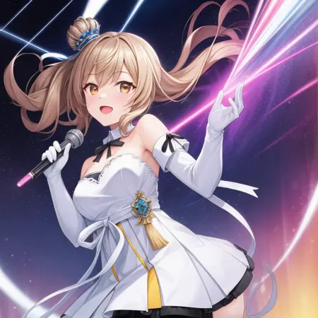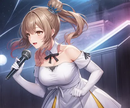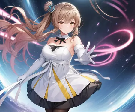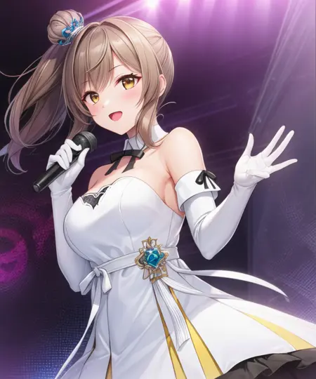 brown eyes, brown hair, brown eyes, bare shoulders, white dress, elbow gloves, eyebrows visible through hair, hair ornament, long hair, strapless dress, white gloves, black pantyhose, satou sasara, 1girl,white skirt,