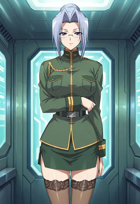 1. ((绿色军装,金色镶边绿色军用夹克,黑色腰带配灰色扣环,长绿色裙子,性感透肉棕色蕾丝过膝袜,)) 绿色高跟鞋,长袖白色衬衫,系好,
