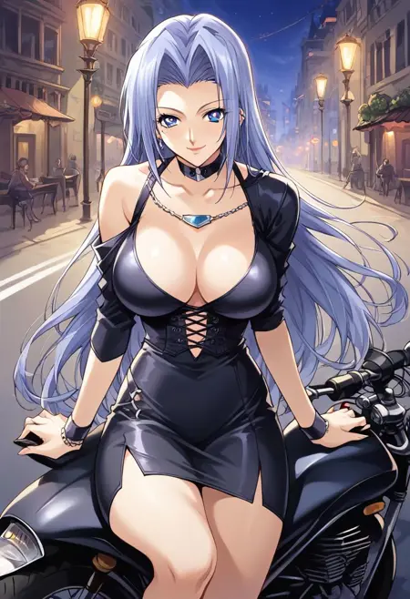 2. (( sexy obscene black outfit, sexy white edged black latex detached collar with red gems, sexy cut-out erotic white edged black latex jacket with red gems, huge cleavage, obscene cleavage, off-finger black latex gloves with red gems, midriff, black belt, sexy cut-out white edged black latex pencil skirt with red gems, sexy cut-out white edged high-heeled black latex boots with red gems, purple thong, ))