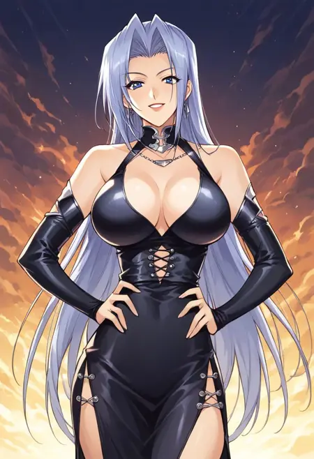 3. ((sexy sleevesless black leather top with short chains and metal plate, huge cleavage, obscene cleavage, midriff, sexy black leather skirt, black leather choker with metal plate, purple thong, long off-finger black leather armsleeve on right hand, short off-finger black leather armsleeve on left hand, ))