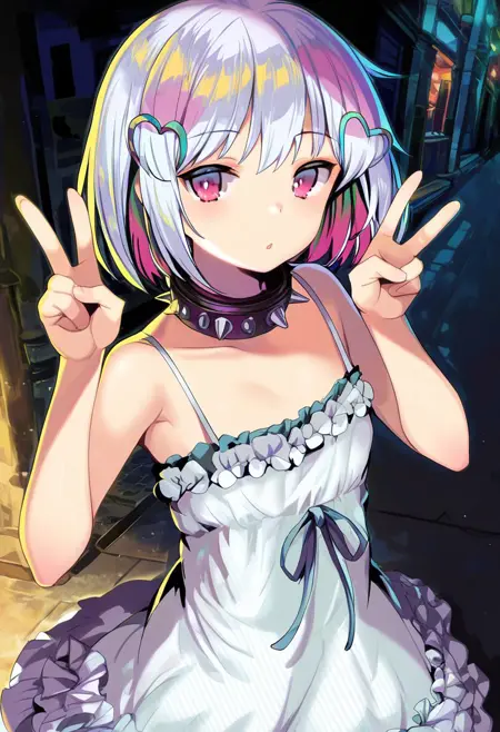 Normal clothes: hair ornament, heart hair ornament, dress, white dress, sleeveless, sleeveless dress, frill, frilled dress, ribbon, blue ribbon, shoes, white footwear, collar, spiked collar, bare shoulders,