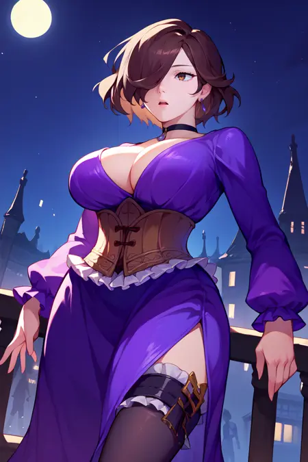 그녀의 전형적인 외모를 위해 "귀걸이, 목걸이, 보라색 드레스, 긴 소매, 가슴 노출, 코르셋, 검은 허벅지양말, 프릴"을 추가하세요.