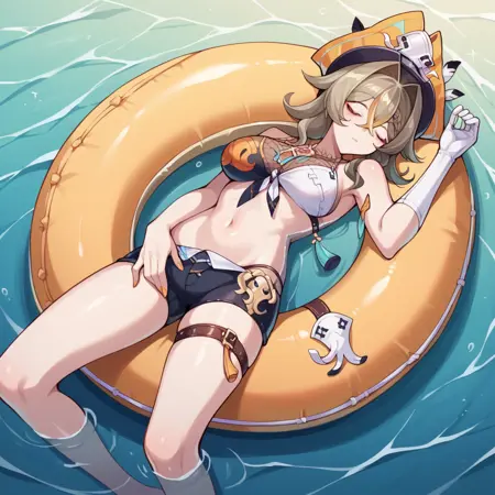 Vill-V_Swimsuit、ビキニ、海賊帽、短いショートパンツ、素足、太ももストラップ、へそ、裸の肩、ネイルポリッシュ、片手の手袋、白い手袋、胸元、