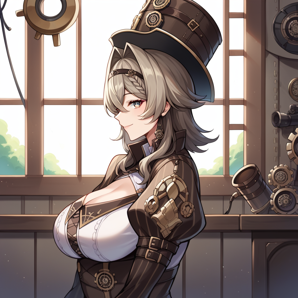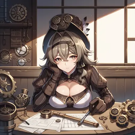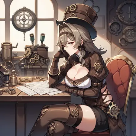 VLVHi3、Fol001、Vil_Def、ミディアムヘア、ツートーンヘア、薄茶色の髪、茶色の髪、灰色の目、ピンクの瞳、髪の流れ、編み髪、黒いヘアバンド、濃茶色の頭部装飾、ステテコ帽、ステampunk、濃茶色のリボン、髪リボン、ギア、歯車、レイヤードな服、白いシャツ、クロスレースシャツ、Oリングベルト、茶色のベルト、濃茶色のベルト、複数のベルト、クロスベルト、サイドカットアウト、胸元カットアウト、濃茶色のショール、ショール(衣装)、カラー付きショール、茶色のコルセット、コルセット、ジュリエット袖、濃茶色の袖、ストライプ袖、茶色の手袋、非対称手袋、袖ベルト、短いショートパンツ、濃茶色のショートパンツ、茶色のウエストケープ、Oリング太ももストラップ、クロスストラップ、ストライプのタイツ、濃茶色のタイツ、ブーツの下のタイツ、太ももブーツ、クロスレースブーツ、茶色の靴、