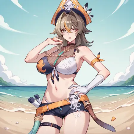 VLVHi3、Fol002、Vil_Swm、ミディアムヘア、ツートーンヘア、薄茶色の髪、茶色の髪、灰色の目、ピンクの瞳、髪の流れ、編み髪、オレンジストライプの髪、海賊帽、オレンジの頭部装飾、帽子の羽、ツートーンビキニ、白いビキニ、黒いビキニ、フロントタイのビキニトップ、腹部、へそ、プリントビキニ、ハーネック、フィッシュネットボディーストッキング、透け感のある胸元、袖なしボディーストッキング、船のホイール装飾、オレンジのリボン、腕用リボン、ペンダントチョーカー、リストバンド、片肘手袋、白い手袋、ジュエリー、緩いベルト、薄茶色のベルト、バックル、パンティストラップ、マイクロショート、黒いショート、デニムショート、茶色の太ももストラップ、Xのタトゥー、白いタトゥー、脚のタトゥー、宝の地図、剣、鞘付き、