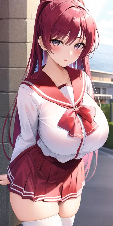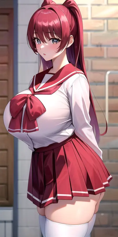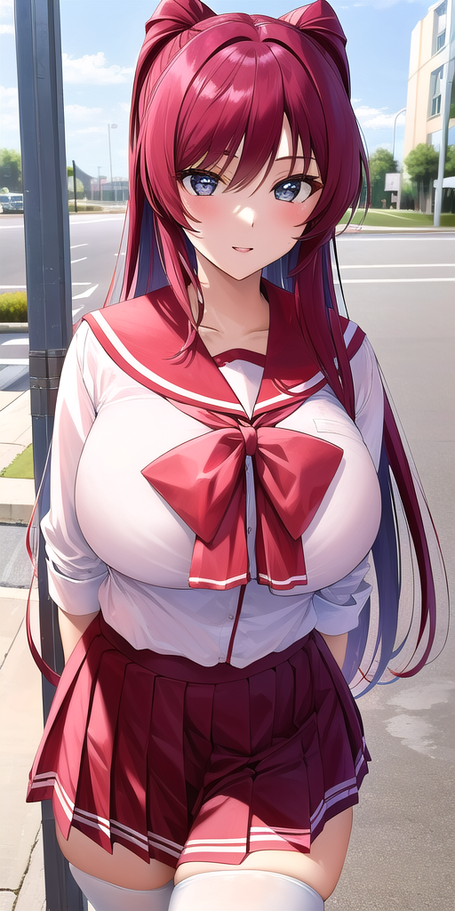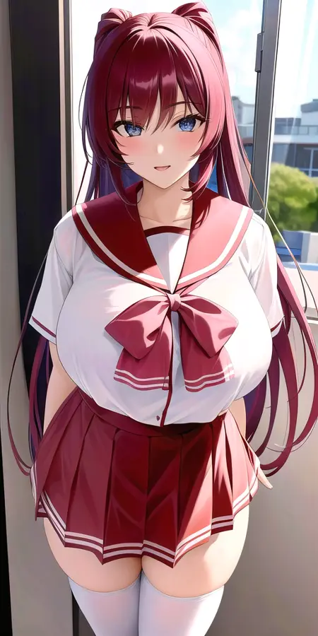 - School_uniform_White_shirt_Red_sailor_collar_Red_skirt_Red_bowtie_white_thighhighs:彼女の制服のみ。