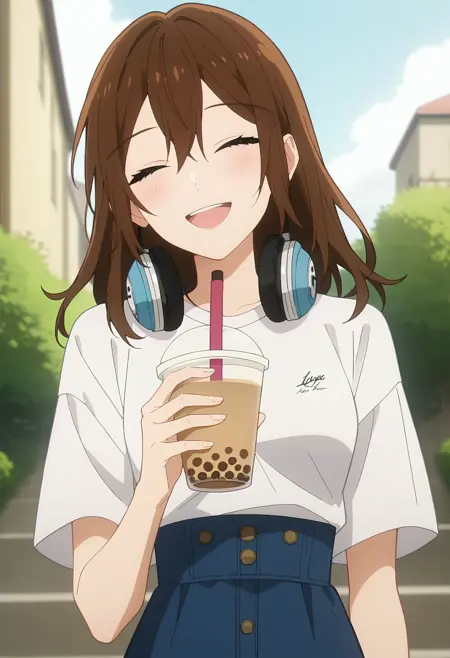 KJOyuriko, brown hair, medium hair, hair between eyes, half closed eyes, brown eyes, low ponytail,
