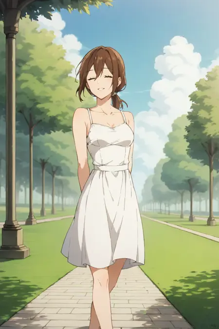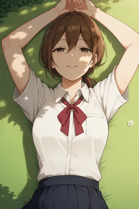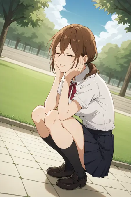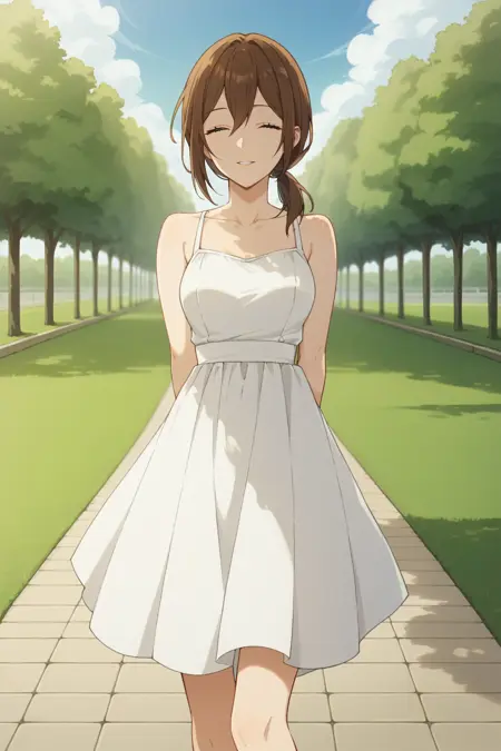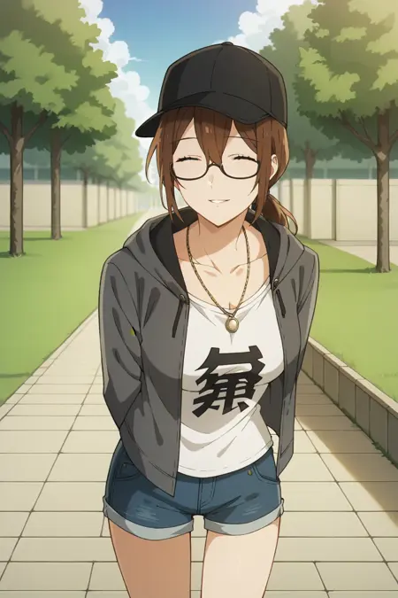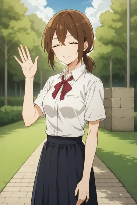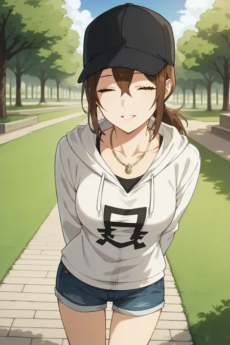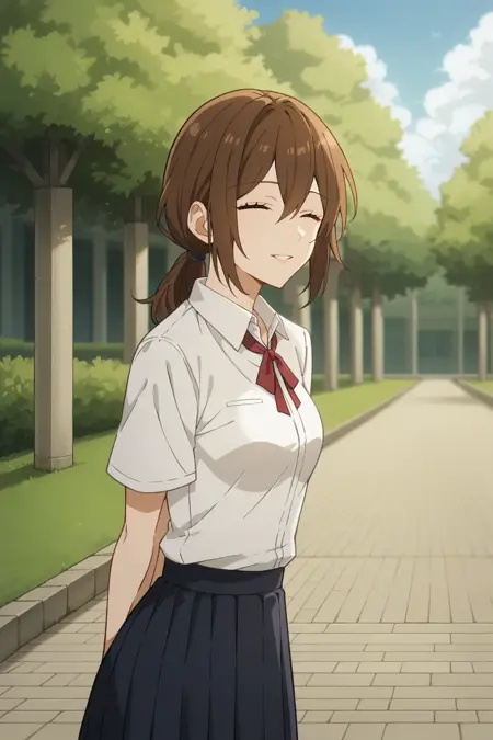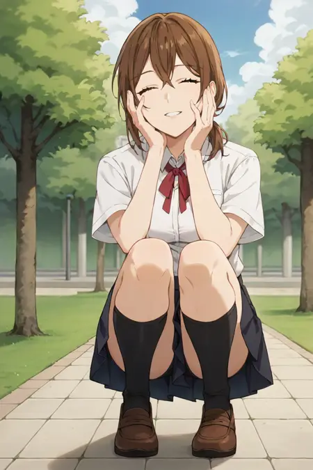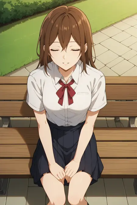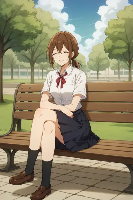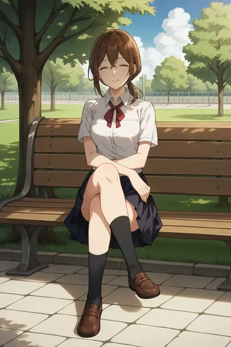 トリガー: 棕色の髪、中長髪、目と目の間の髪、閉じた目、 brown eyes、低いポニーテール、ストレートヘア