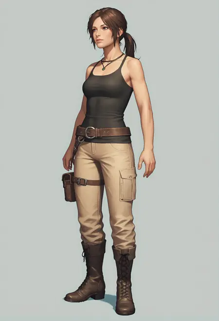 - laracf, 1girl, breasts, brown hair, ponytail, brown eyes, lips, necklace, tanktop, pants, belt, boots
